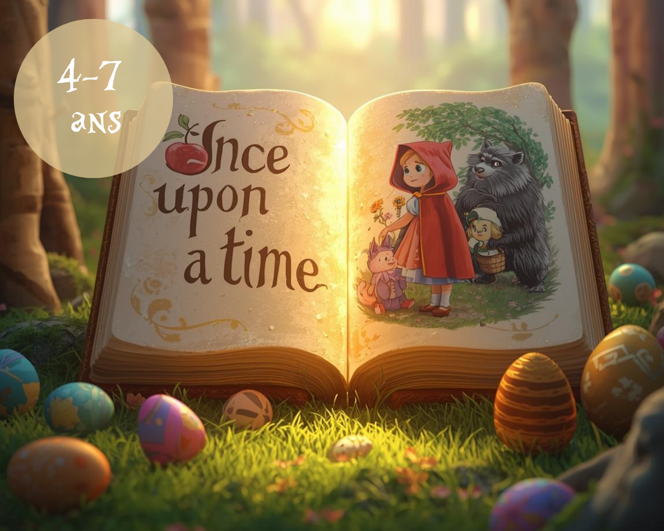 Mystère au Pays des Contes : la Poule aux Œufs d’Or s’est égarée dans la forêt ! Dans sa fuite, elle a semé derrière elle huit œufs colorés… et un précieux œuf d’or. Aide-la à tous les retrouver ! Muni de ton précieux panier, aventure-toi dans la forêt des contes pour partir à la recherche des œufs. Mais attention, tu devras aussi résoudre des énigmes ! En chemin, tu pourras aider Jack à retrouver son haricot magique, démasquer Barbe Bleue ou encore aider Cendrillon à remettre la main sur sa célèbre chaussure.